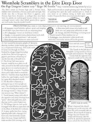 We have here 100+ rooms of evil wizard's castle, with a number of fairly interesting tricks and characters, and a large cast of unique Midkemian monsters living in close tenancy -- screamers, hard luck "snagers" (indistinguishable from doors!), fuzzy pests, goldmoths (indistinguishable from gold pieces!), etc. All are statted out in conformity with THE TOME OF MIDKEMIA fantasy roleplaying game. This game, never published, works with "hits to kill", levels, d20 to hit rolls, damage done with various dice sizes, and spells of familiar stamp with flavor words tacked on like dishes from a gastropub menu (MATCHLESS SLEEP, UNALTERABLE QUEST, THROW LIGHTNING).