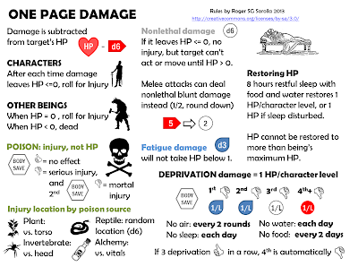 The rules for damage and healing. I'm particularly happy with "1 HP/level fatigue damage" because it covers so many situations - some to be expanded on in the wilderness rules in "52 Pages Expert Set". Walking through a rainstorm won't kill you, but it will make you less durable in your fight against those ogres.